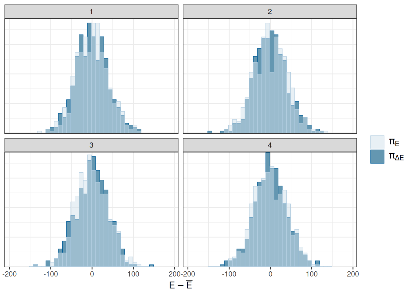 Overlaid histograms showing energy__ vs the change in energy__. See Betancourt (2016) for details.