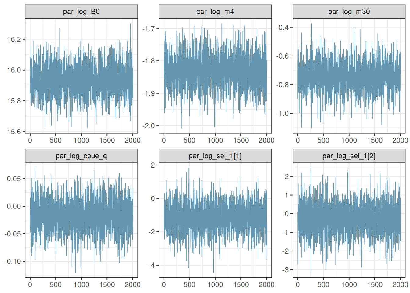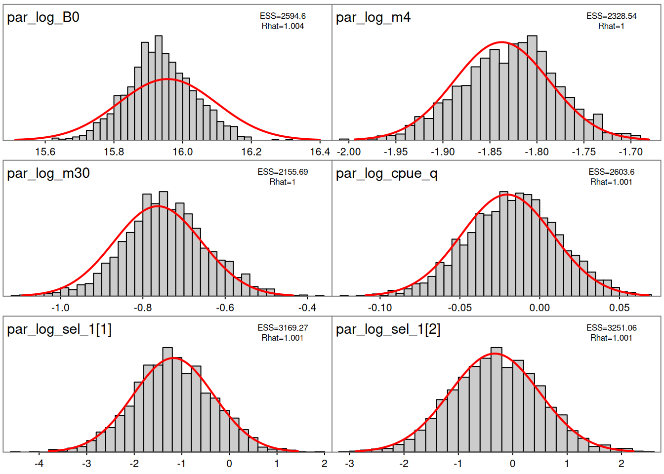 This vignette demonstrates how to conduct Bayesian inference for the CCSBT stock assessment model using the SparseNUTS package and the sparse inverse Hessian generated by RTMB (https://github.com/noaa-afsc/SparseNUTS). We illustrate the setup, sampling procedure, and posterior diagnostics. If you have not done so already, you will need to install the packages below: