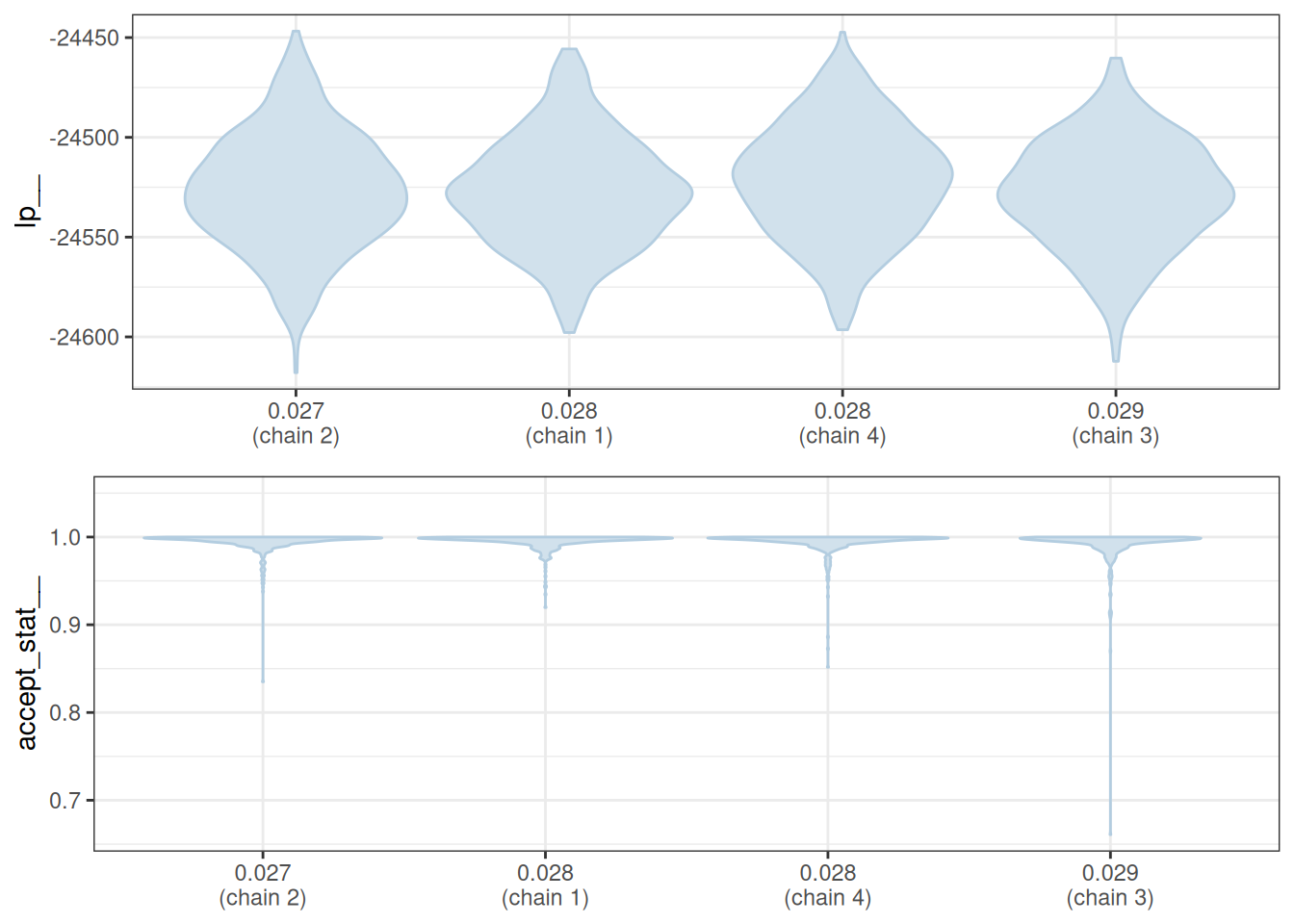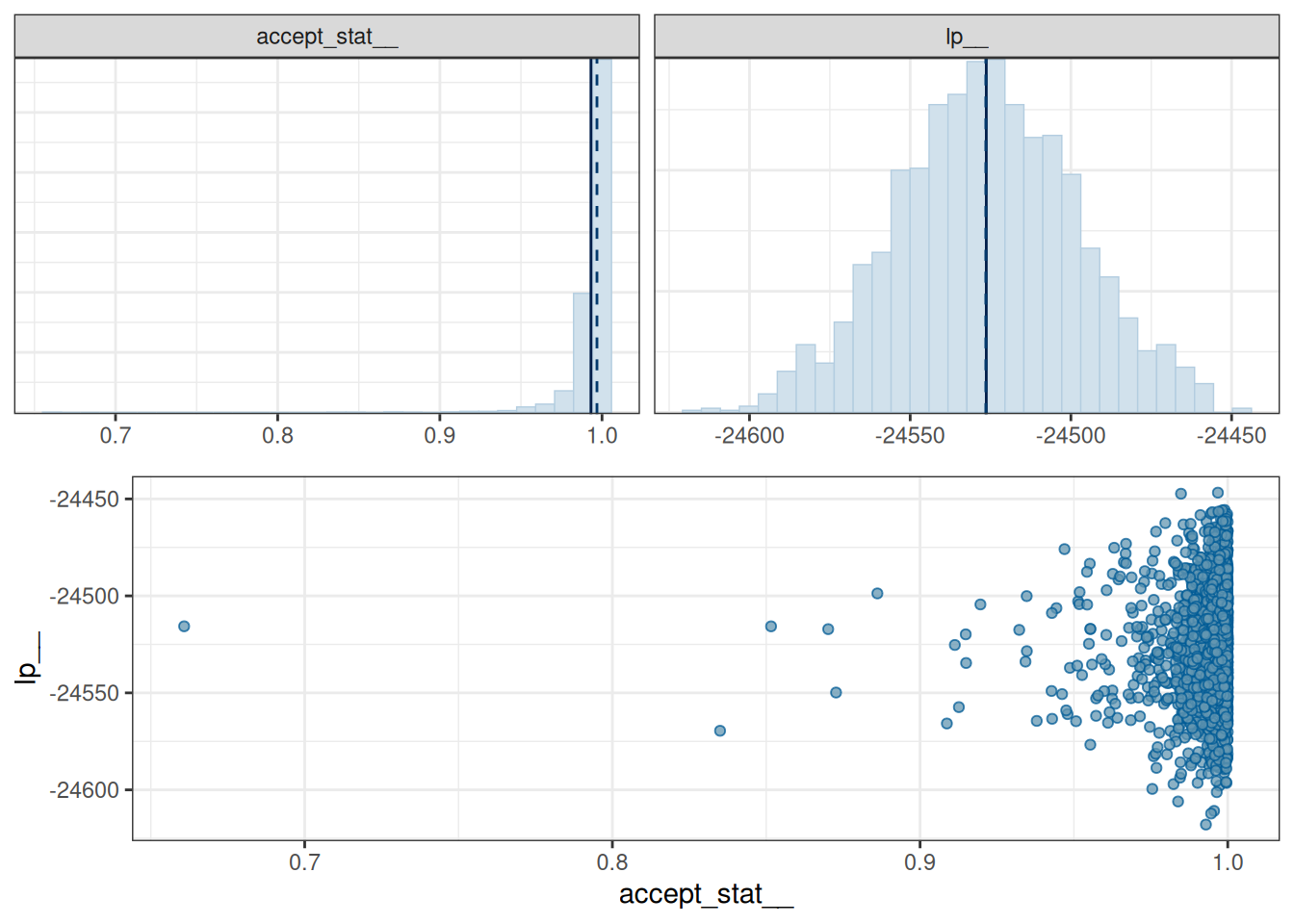 mcmc_nuts_acceptance(x = np, lp = lp)`stat_bin()` using `bins = 30`. Pick better value `binwidth`.