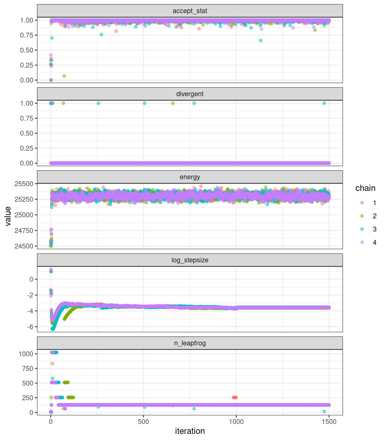 This MCMC was split into 4 chains, each with a warm-up of 1000 iterations followed by 500 iterations. This resulted in 2000 posterior samples (i.e., no thinning) for 1553 parameters. This MCMC took 49 minutes to complete.